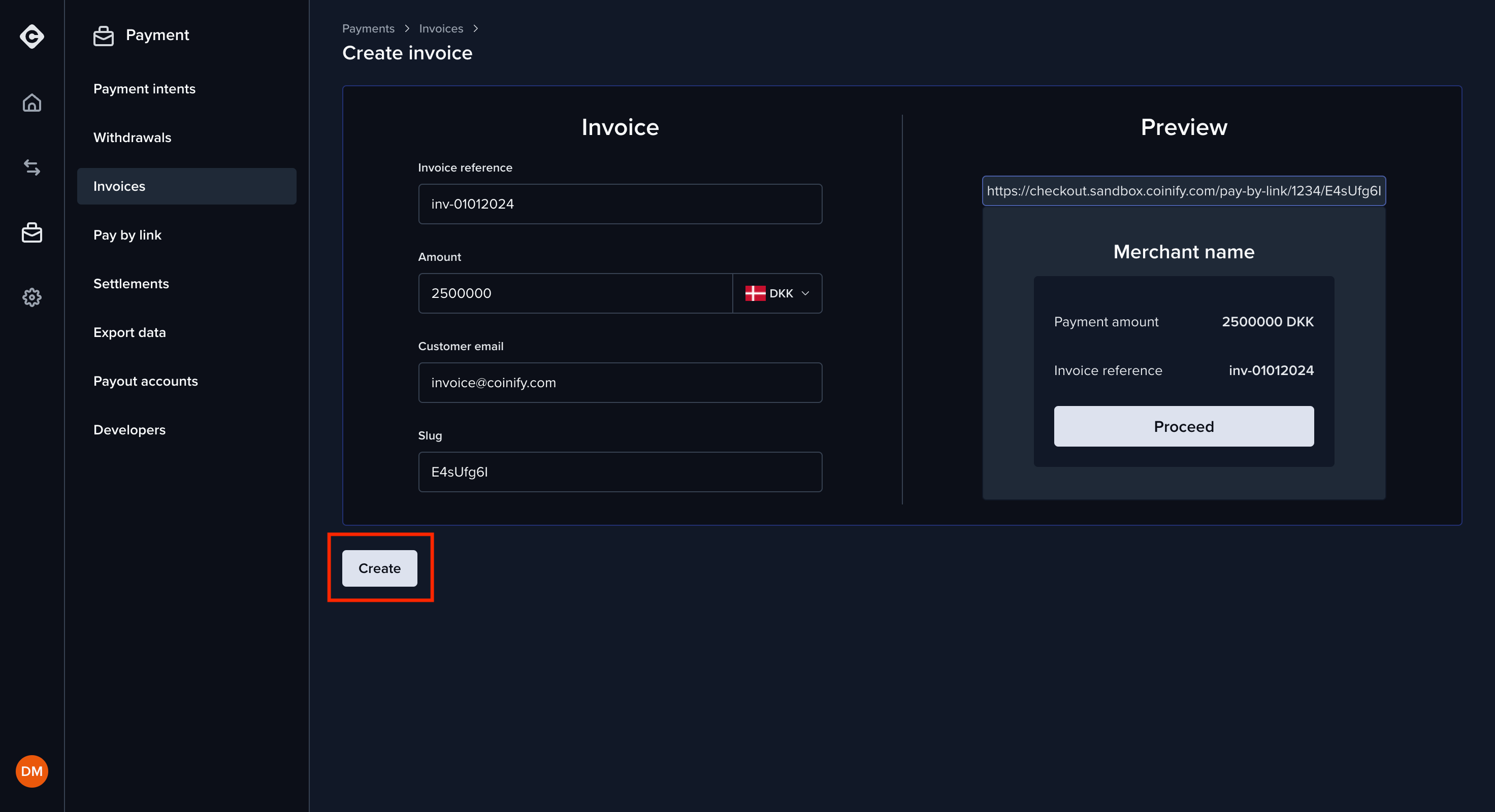 3. Tap the “Create Invoice” button to send your Coinify Invoice via email.